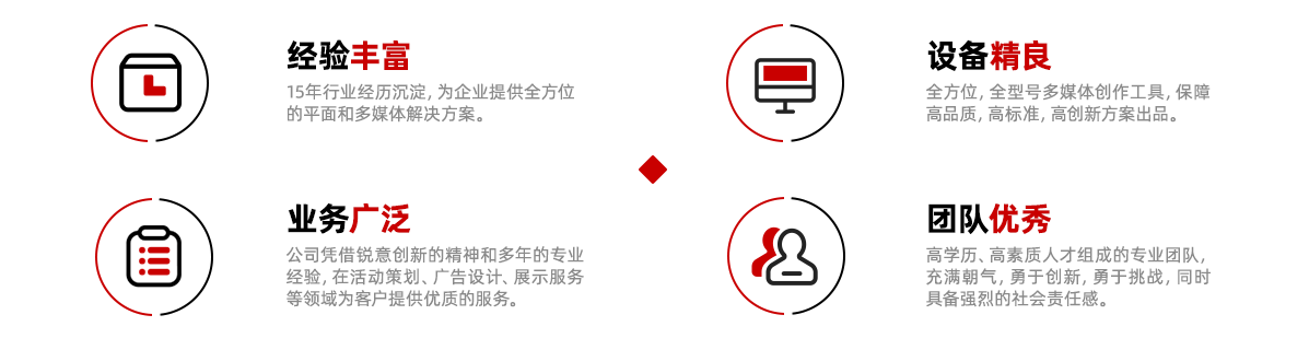 憑借銳意創(chuàng)新的精神和多年的專(zhuān)業(yè)經(jīng)驗(yàn),在活動(dòng)策劃、廣告設(shè)計(jì)、展示服務(wù)等領(lǐng)域?yàn)榭蛻?hù)提供優(yōu)質(zhì)的服務(wù)。